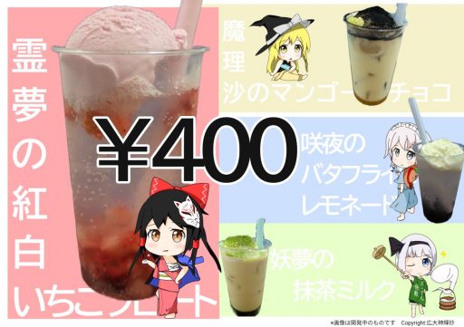 そうですね。広島大学では毎年夏に、学祭とは別にゆかたをテーマとした「ゆかたまつり」という夏祭りを開催しているのですが、そこでもコスプレ参戦して、キャラクターモチーフのドリンクを来場者に振る舞いました。学外の人たちも霊夢や魔理沙といった、東方のキャラクターを分かってくれたのは嬉しかったですね。
