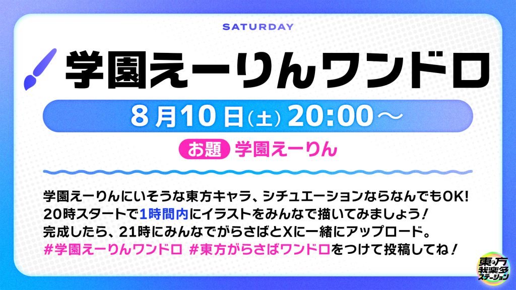 本インタビューの掲載を記念して、Discordサーバー「東方我楽多ステーション(通称:がらさば)」で毎週土曜日に実施している「ワンドロの土曜」のお題を「学園えーりん」といたします!