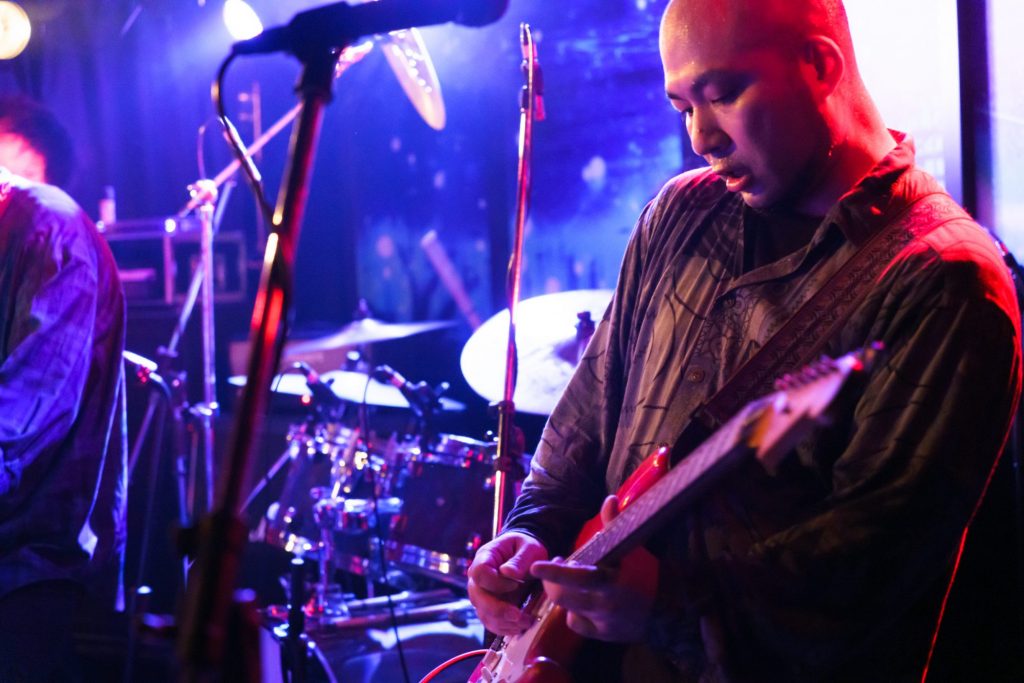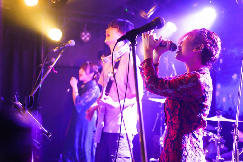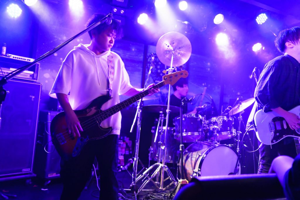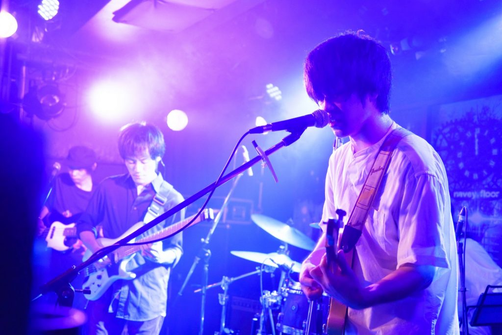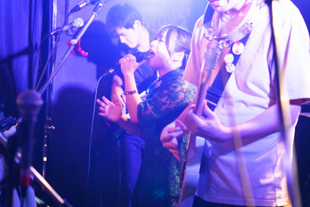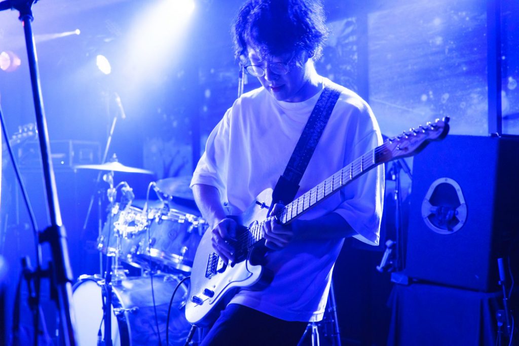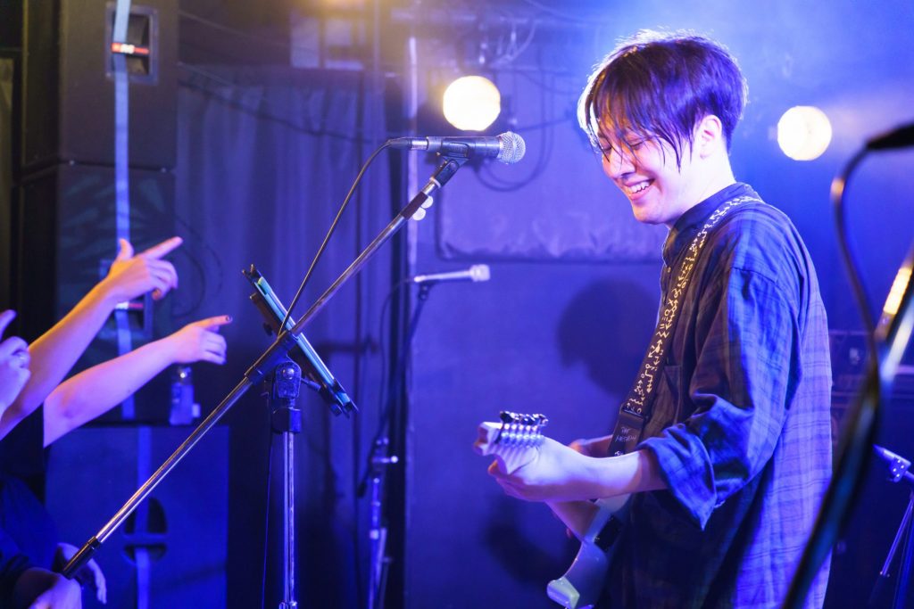 2曲目『水底落伍心中』 、3曲目『フリーフォール』 とアッパーな曲が続く。各楽器から身体に響く音が立て続けに聞こえてくるなかで、Gt.&Vo.湯豆腐の淡く、色気すら感じる声がフロアに広がる。アンバランスで、しかし心地よく聞こえる不思議な感覚だった。『フリーフォール』はハルトマンの妖怪少女のアレンジ。古明地こいしのようにパワーがありながらも、ゆらりと人の懐に入ってくる、そんな印象を受けた。