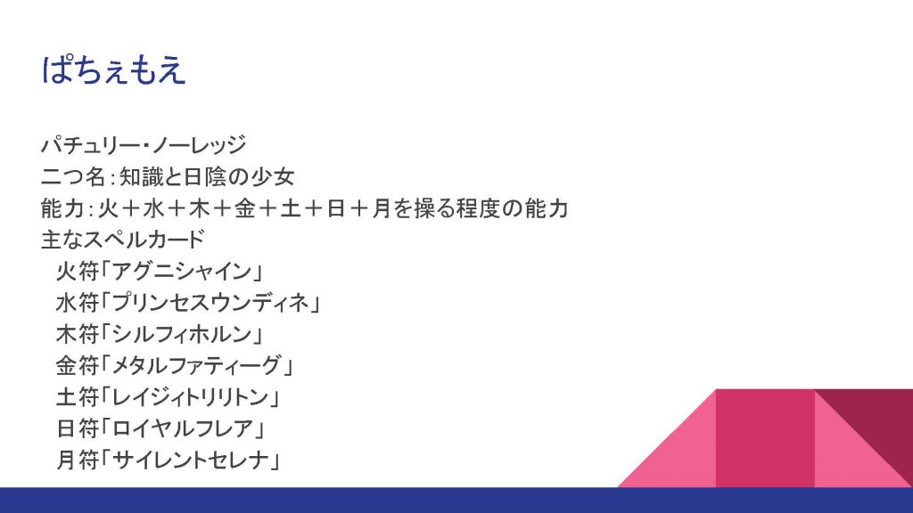 今回は、好きなキャラクターであるパチュリーさんを取り上げましょう。まずは、基本的なところからおさらいしたいと思います。