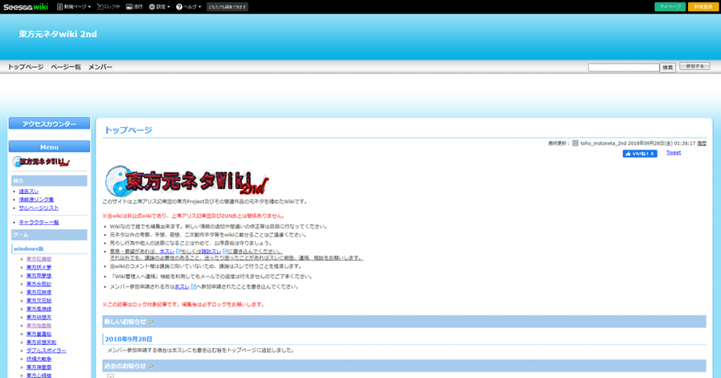 有志の人たちにより編集されている東方Wikiはいくつかありますが、筆者は「東方元ネタwiki 2nd」をよく参考にしています。2004年に本スレが立てられているだけあって、すさまじいほどの情報が蓄積されています。