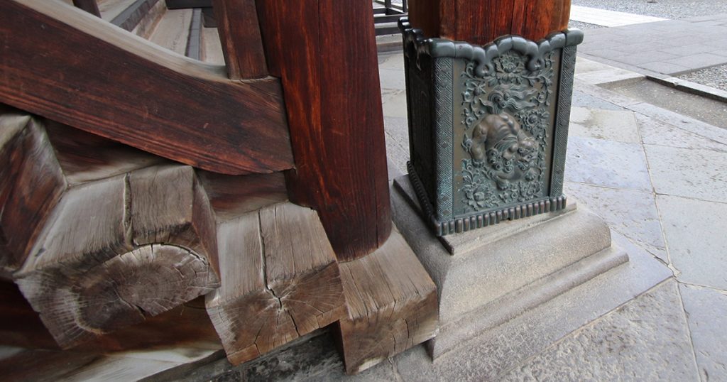 本堂の周りには「地震柱」と呼ばれている柱があります。それぞれの度合いに差はありますが、どれもねじれているため蓮子やメリーが語っている柱の位置は特定できません。ただ、本堂東側の出入り口にある柱は土台から随分とずれていますので、画像に写っているのが対象の地震柱であるかもしれません。