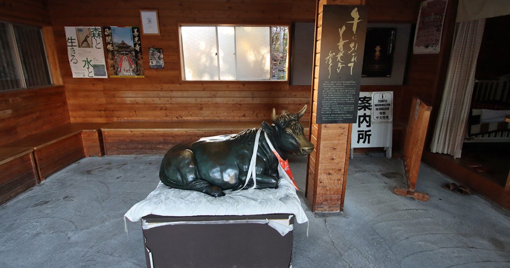 『伊弉諾物質』に収録されている「牛に引かれて善光寺参り」という曲名。信心の薄い老婆が近くの川で布をさらしていると、牛が現われ布を角にかけて走り出したので、追いかけたら善光寺の境内にたどり着いたという伝説が元になっています。そのためか、善光寺境内の入口にある案内所には牛の銅像が安置されています。また、この話は善光寺から約40km離れた布引観音(布引山釈尊寺)の縁起としても伝わっています。