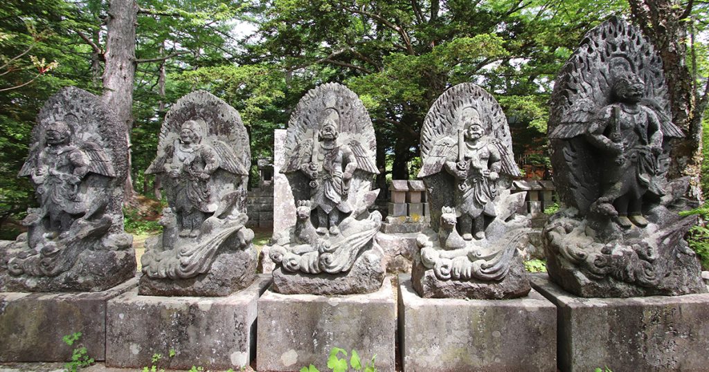 飯縄山は戸隠神社中社付近からも登山道があり、戸隠側でも飯縄信仰が目に見える形で存在します。特に中社と奥社入口の中間地点にある「公明院」では、精巧な作りの飯縄大権現像が5つも並んでいるのでおすすめです。こういった像を見るとわかりやすいですが、飯縄大権現は剣や縄を持ち白い狐に乗った鴉天狗としての姿で表現されていることが多いです。