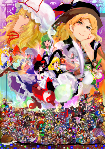 幻想郷の賢者である八雲紫と摩多羅隠岐奈は重要なキャラなので、この二人は大きく描きました。また彼女たちの従者たちも、それぞれ近くに配置する形で描きました。