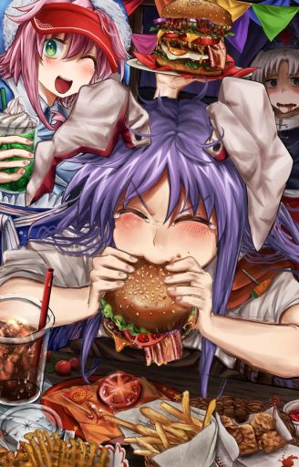 ハンバーガーをただ単に食べさせるだけだと物足りないので、ある程度ストーリーをつけるために、美宵ちゃんを提供させてる側にして、それを永琳が見てるという構図にしました。それとハンバーガーも美味しそうに見えるように、うどんげの表情にも力を入れました。