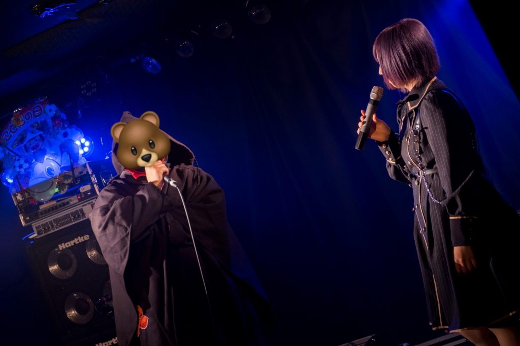 シグマさんとコアラさんの大きな掛け声に、観客は大きな拍手で応えます。可愛らしい女性の声と、力強い男性の声が合わさることで、『錠剤』はいつもと違う姿となって現れました。ステージに立つ3人が放つ音楽のパワーに合わせて我々も全力でペンライトを振ります。