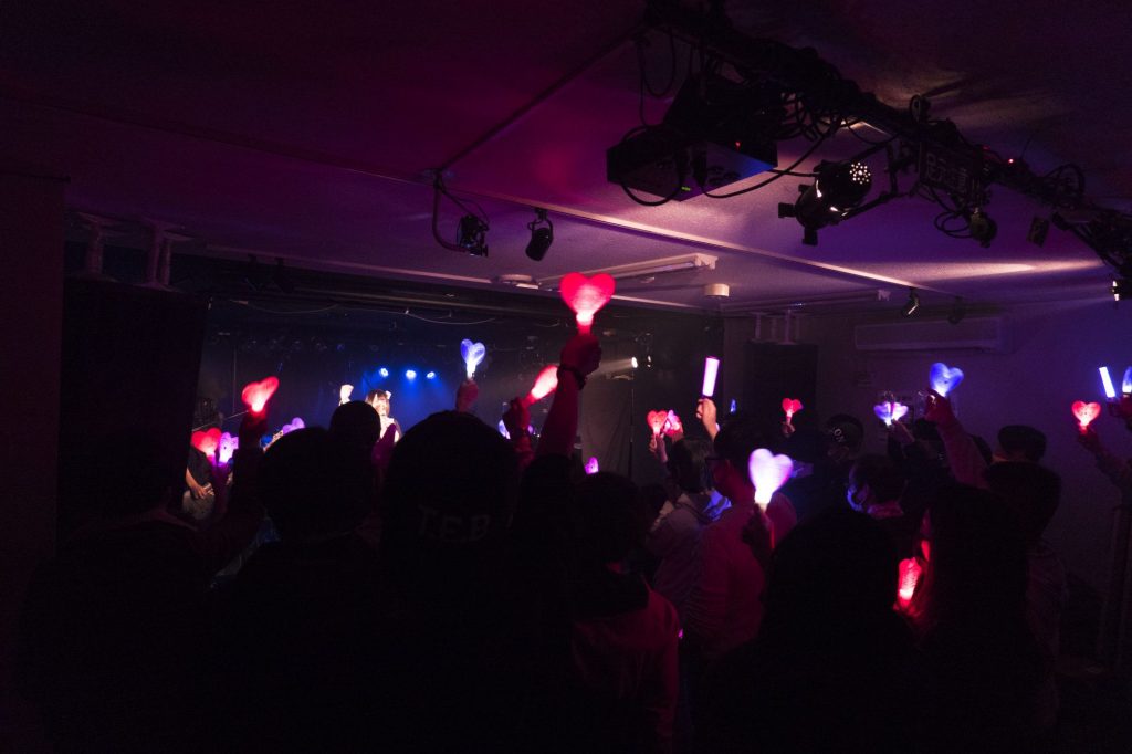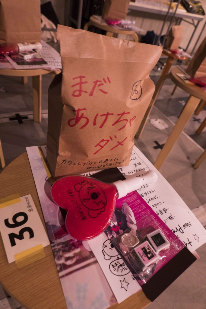 開演前の池袋Live House monoのフロアには、整列された椅子がずらりと並んでいる。椅子の上には中身いっぱいに詰まった紙袋とペンライト、チョコレートやパンフレットが、こちらもずらりと並んでいる。改めて写真で見ても、なんとも異様な光景だ。これからライブが始まるフロアとは思えないくらい情報量が多い。