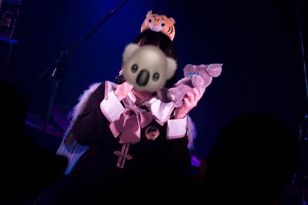 愛の大きさ、重さに狼狽する僕であったが、ライブは進んでいく。ナイフの新年一発目の曲は『媚薬』だ。両手を掲げ交互にフリフリするいつもの振り付けをVoコアラがレクチャーする。その手には先程のコアラのぬいぐるみが握られている。つられてフロアのみんなもぬいぐるみを装備。一見シュールな景色だが、Vo.コアラは「(フロアのみんな)かわいい~~!」とご満悦のご様子。