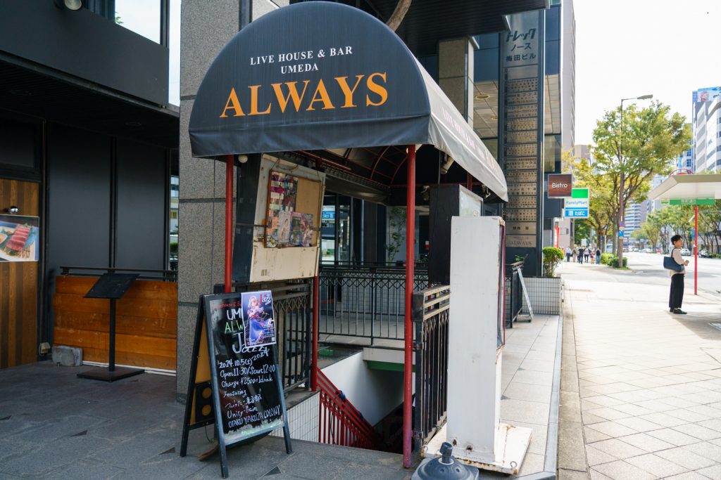 「紅楼Jazz」の会場である「梅田ALWAYS」は、JR大阪駅から徒歩15分程度。雰囲気のある黒い半月アーケードの階段を降りると、沢山のフライヤーがお出迎え。