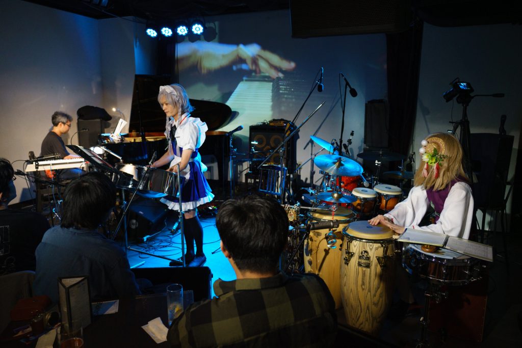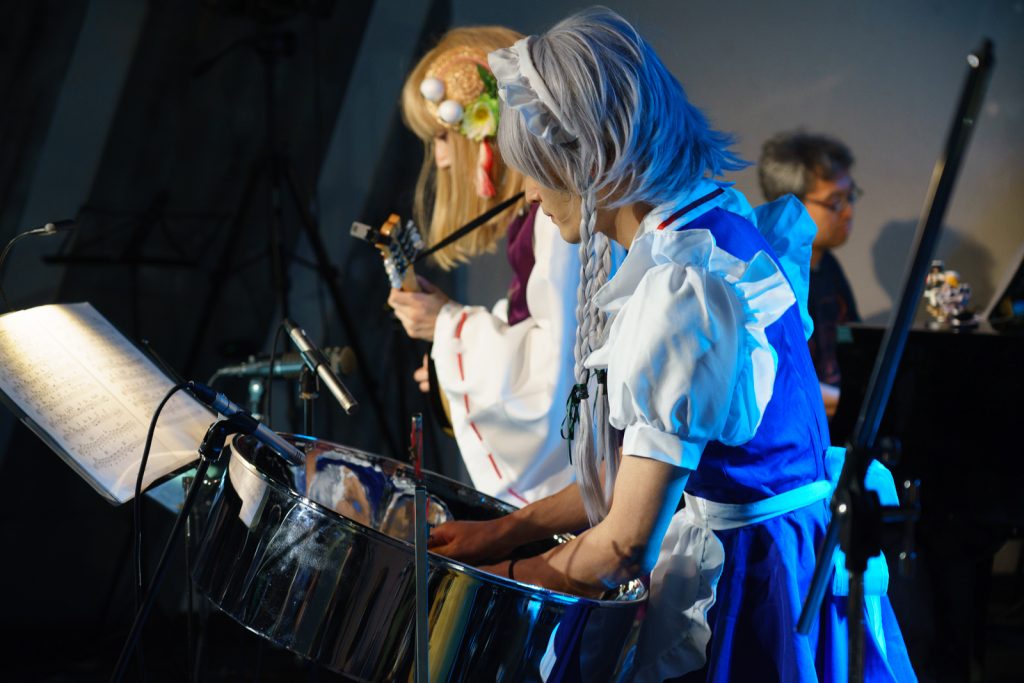 スチパンの奏でる不思議な響きのイントロ。重なったピアノが弾き継いだと思ったら……さっきまでスチパンを演奏していたはずの咲夜さんが、いつの間にか小太鼓を抱えてません?