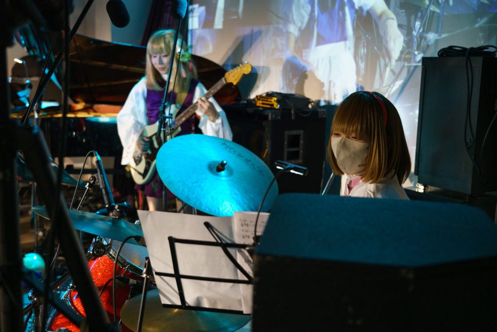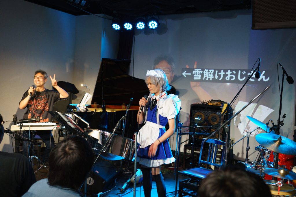 拍手の後にピアノのO太さんの「こんば…違…、こんにちは〜」でひと笑い。「新譜が間に合わなかったお詫びに、今日はほぼ新曲です!」という同人らしいワードが飛び出したところで、2曲目へ。