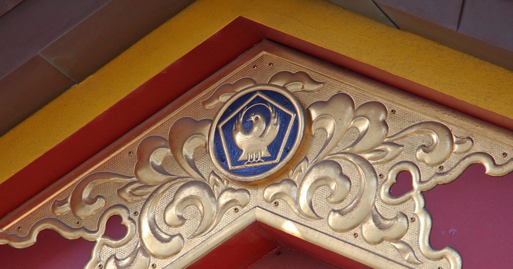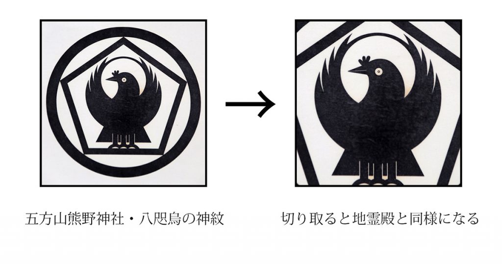 明治12年に造営された社殿をよく見ると、違った意匠をした八咫烏の紋が確認できます。八咫烏の意匠が2種類あったことが気になり、千島宮司に確認したところ、正五角形と八咫烏を組み合わせた御神紋が成立したのは明治時代ではないと思われるようです。時期は定かではありませんが、歴史的な尺度では比較的最近のようで、言い換えれば約千年前である創建当時の理念が現代まで受け継がれている証でもあります。