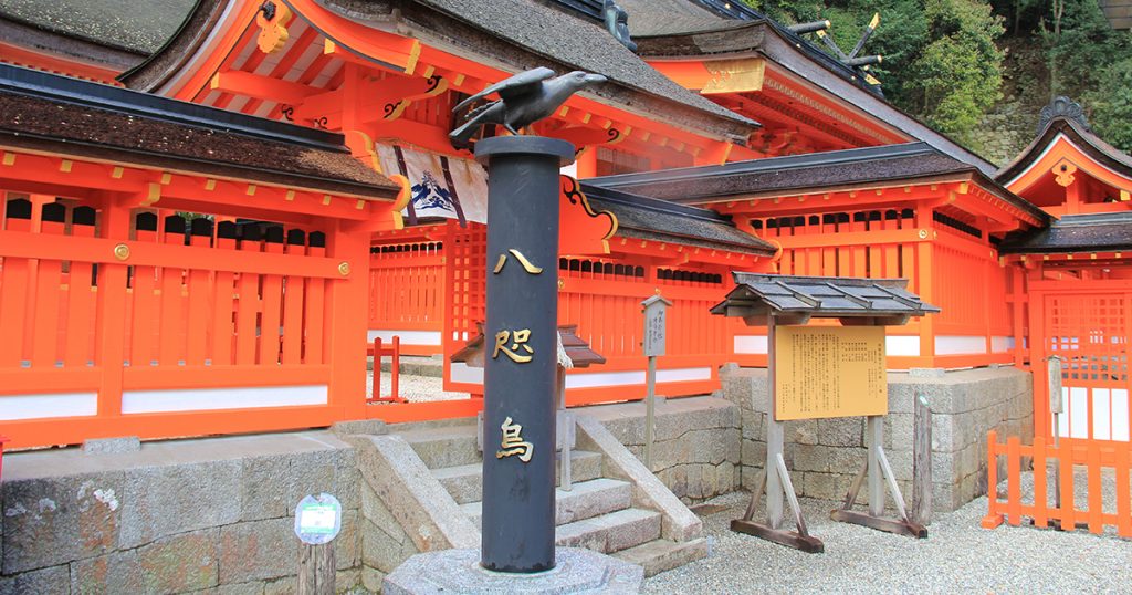 皇室の初代である神武天皇(当時は即位前)を導いた八咫烏は、案内を終えた後に那智山で烏石に姿を変えて休んでいると伝わり、その烏石は熊野那智大社の御本殿に囲まれた位置に現存しています。また、境内にある御縣彦社では八咫烏が単独で祀られており、正面には三本足の姿をした八咫烏の銅像が参拝者を迎えてくれます。
