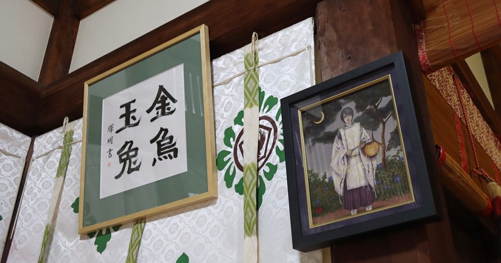 熊野那智大社を含めた熊野三山は全国の熊野神社の総本社であり、八咫烏伝承の本場とも表現できます。五方山熊野神社の勧請者は、他にもいくつかの逸話を彼の地に残しており、熊野と深い関係があります。それを反映するかのように、五方山熊野神社の拝殿内部は、八咫烏や安倍晴明公に関連したもので彩られています。