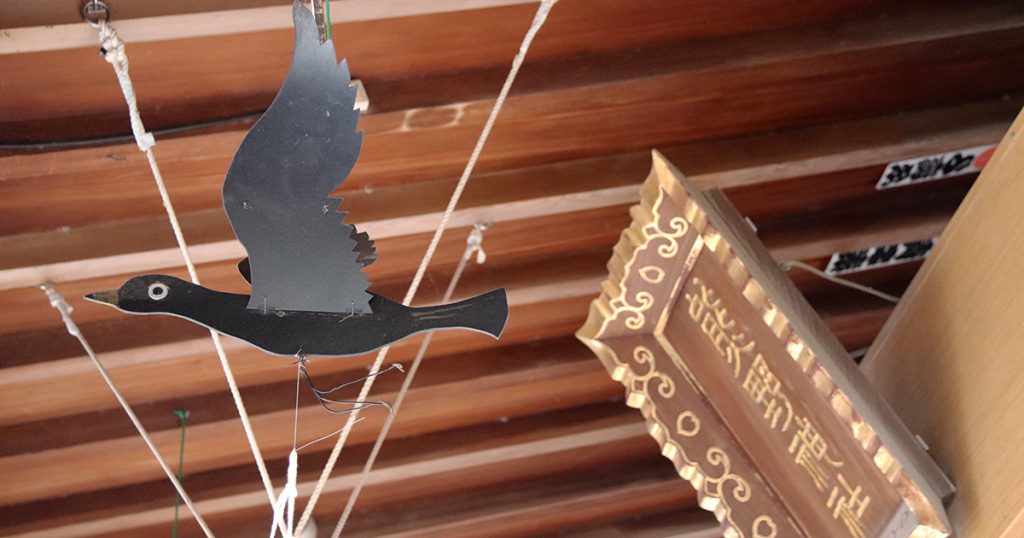 こちらの五方山熊野神社ですが、様々なものを自分たちで作り上げています。拝殿内部で羽を広げている八咫烏も神社側のお手製で、紐を引っ張ると羽ばたく仕様です。残念ながら現在は作動しなくなったそうですが、かつては賽銭箱の上で参拝者を迎えてくれました。