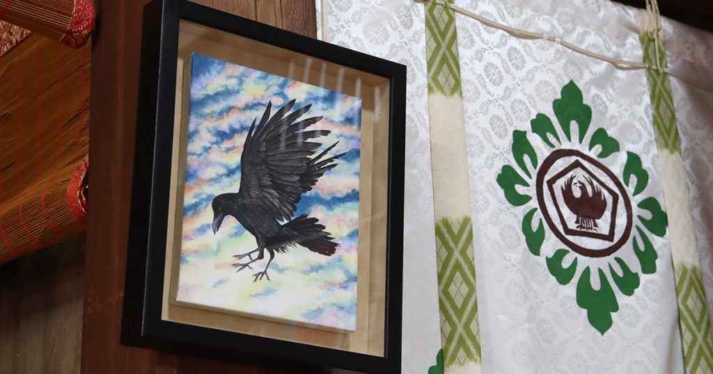 こちらの五方山熊野神社ですが、様々なものを自分たちで作り上げています。拝殿内部で羽を広げている八咫烏も神社側のお手製で、紐を引っ張ると羽ばたく仕様です。残念ながら現在は作動しなくなったそうですが、かつては賽銭箱の上で参拝者を迎えてくれました。