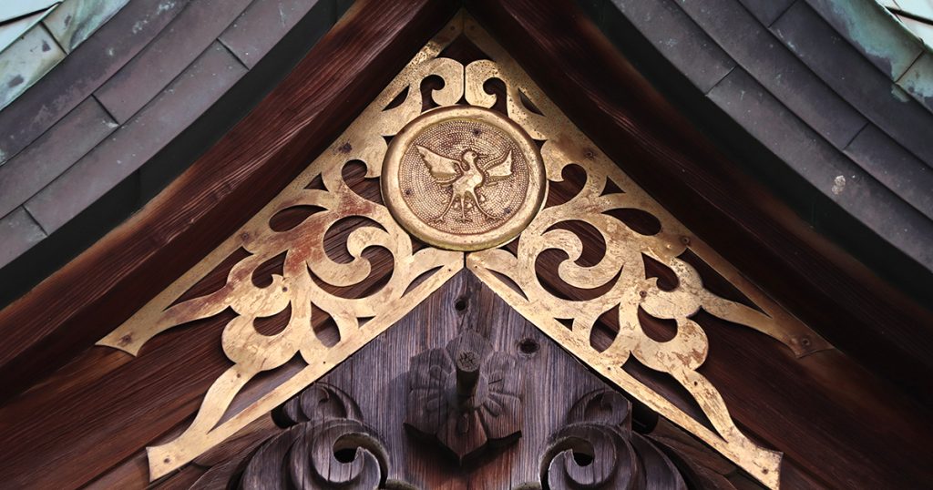 明治12年に造営された社殿をよく見ると、違った意匠をした八咫烏の紋が確認できます。八咫烏の意匠が2種類あったことが気になり、千島宮司に確認したところ、正五角形と八咫烏を組み合わせた御神紋が成立したのは明治時代ではないと思われるようです。時期は定かではありませんが、歴史的な尺度では比較的最近のようで、言い換えれば約千年前である創建当時の理念が現代まで受け継がれている証でもあります。