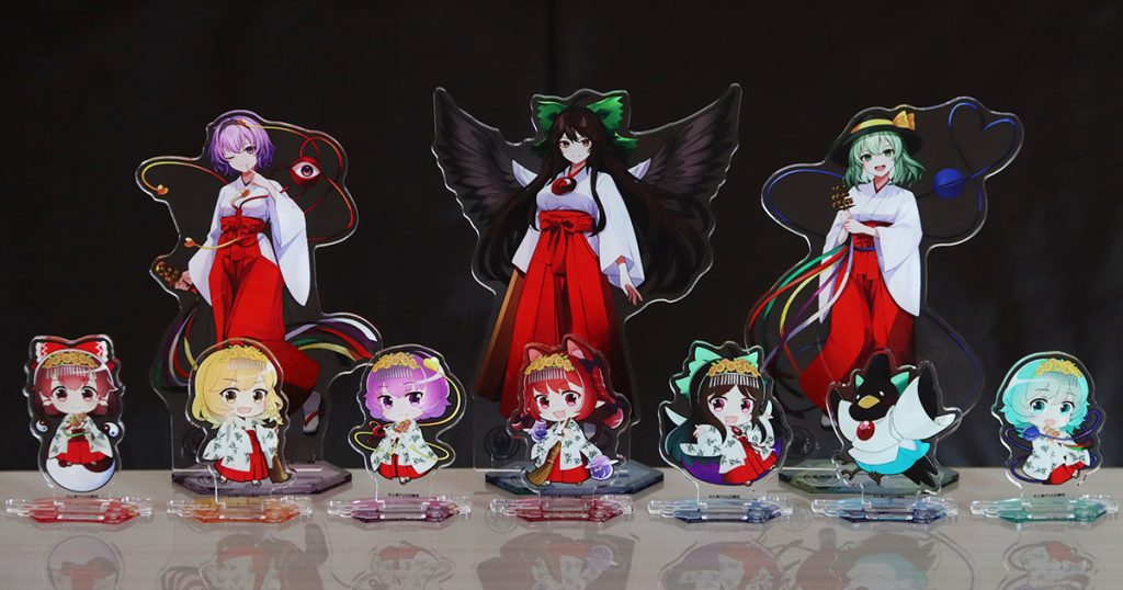 グッズに選ばれているキャラクターは、キービジュアルにもなっている霊烏路空と、地霊殿の主とその妹である古明地姉妹。デフォルメキャラでは地霊殿に住んでいる4人と自機の2人。いずれもコラボのきっかけになったステンドグラスがある建物や、そこを舞台の一つにした異変に関わっているキャラクターであり、企画の主導者である神社側がしっかり調査していることがうかがえます。今回のコラボに関係する『東方地霊殿』だけではなく、橙のスペルカードに安倍晴明ネタがあることも千島宮司は把握していて、幅広く調べていると言えます。