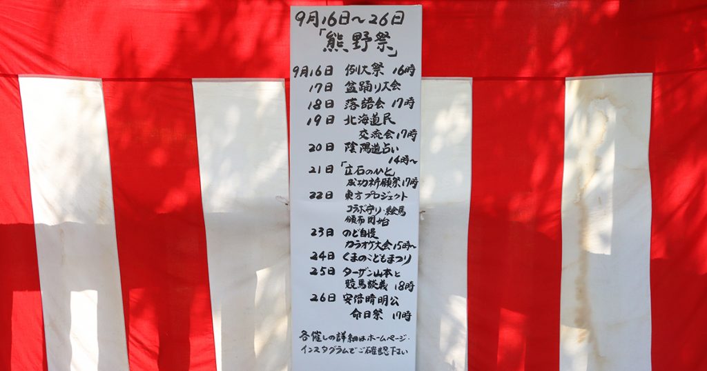 熊野祭期間の日中に境内で流れていた音楽も、作詞が千島宮司、作曲が併設の幼稚園関係者によるもの。自力で様々なものを制作し神社を盛り上げようとする姿勢は、東方原作STGに似ていると言えるかもしれません。二次創作が盛んな東方というジャンルの末席にいる筆者としては、五方山熊野神社の姿勢に親近感を覚えます。