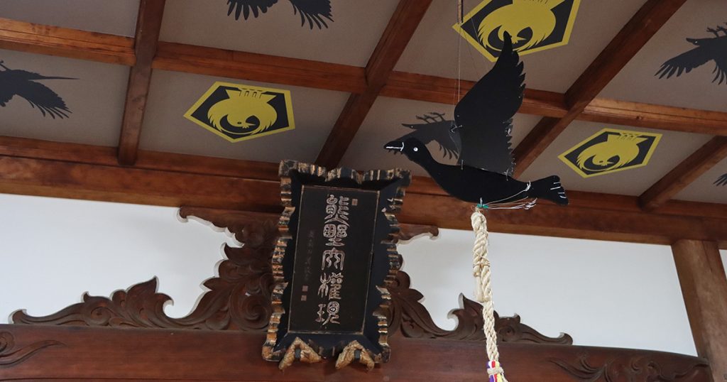 熊野那智大社を含めた熊野三山は全国の熊野神社の総本社であり、八咫烏伝承の本場とも表現できます。五方山熊野神社の勧請者は、他にもいくつかの逸話を彼の地に残しており、熊野と深い関係があります。それを反映するかのように、五方山熊野神社の拝殿内部は、八咫烏や安倍晴明公に関連したもので彩られています。