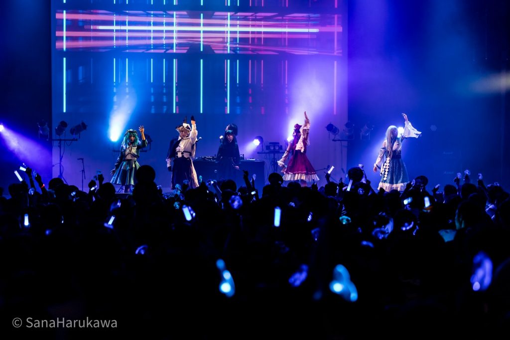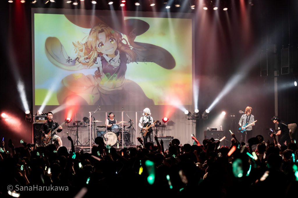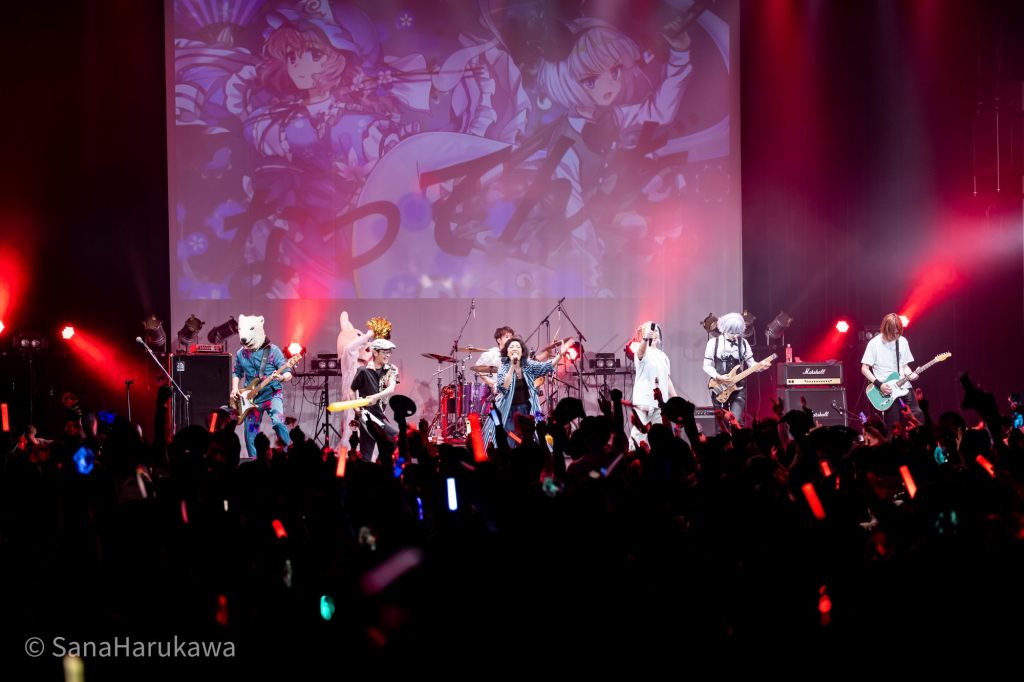 『東方LostWord』MV プロジェクト楽曲「世界一位」からライブがスタートし、書き下ろし楽曲「Membrane」へ。ゴリゴリのEDMサウンドはフロア全体を一気に縦ノリで満たし、魂魄妖夢のMVが印象的な楽曲「Disillusion」へと誘っていきます。