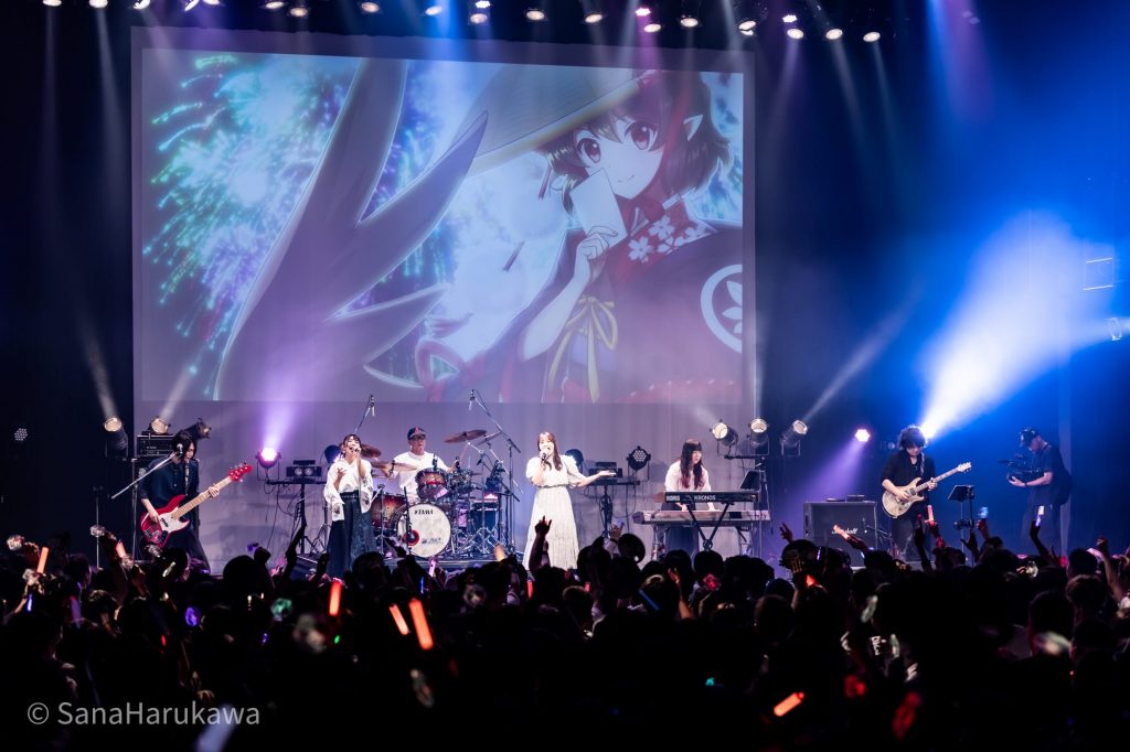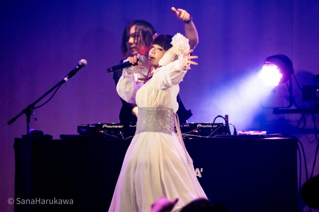 続く曲は「ヒトイキの証明」、なんと本日が初披露の楽曲です。『東方LostWord』に今後実装予定の曲とのことですが、まだどこにも公開されていない楽曲のドロップはライブ参加者への特別なサプライズとなりました。最後の曲は「星を廻せ月より速く」。TUMENECOが現を夢にしたあと、世に放った1曲は、今や秘封アレンジの代表曲の一つとなっています。厚みのある旋律に乗せたストーリー性の強い歌詞が歌いあげられ、誰しもが蓮子とメリーの関係に、行く末に、思いを馳せたことでしょう。