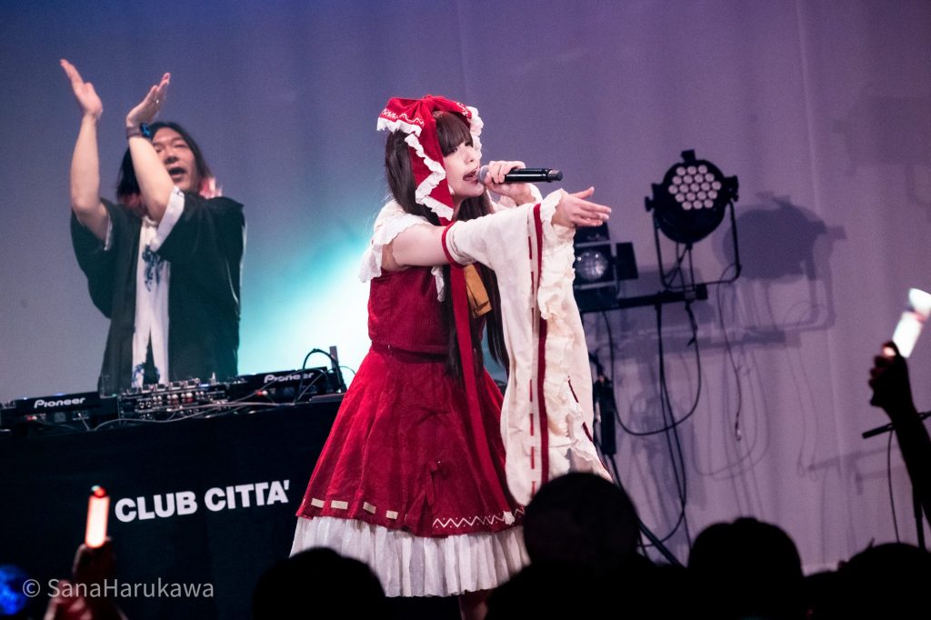 河城にとり(Per.林檎酢さん)、博麗霊夢(Per/Vo.ayameさん)を従え、Vo.nomicoさんがステージイン。DJにはMasayoshi Minoshimaさんの姿が。