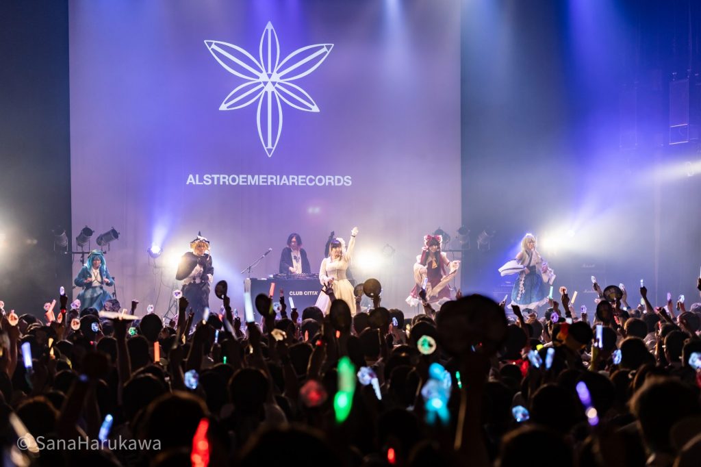 歌唱をVo.綾倉盟さんに代わって、東風谷早苗(Per.KI紗さん)、霧雨魔理沙(Per.13さん)がステージイン。ダンサー陣が揃っての「That Full Moon Over the Haunted Ship」。続いて「SACRIFICE」が投下され、ハードコアの火で焼き尽くすと、最後の曲「Bad Apple!! feat.nomico」へ。みんなが大好きで、みんなが聴いてきた曲。たくさんの歴史が詰まった曲。そんな文脈を伝えるように、Alstroemeria Recordsはこの曲をフロアにぶつけます。