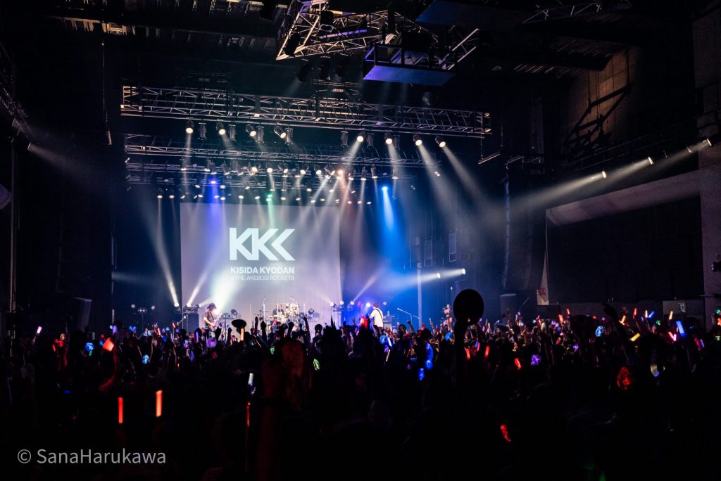 3サークル目は岸田教団&THE明星ロケッツ。ステージ左側からBa.岸田さん、Dr.みっちゃんさん、Vo.ichigoさん、Gt.はやぴーさんがスタンバイし「明日ハレの日、ケの昨日」からスタート。