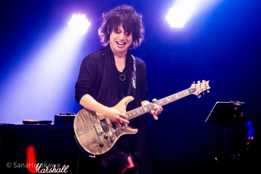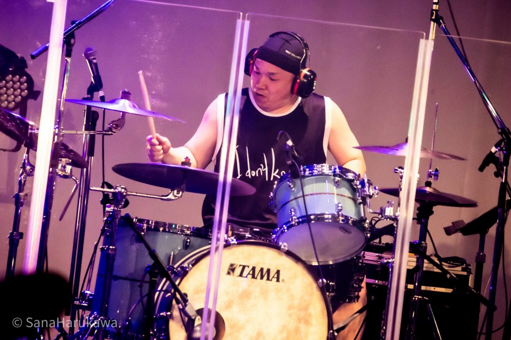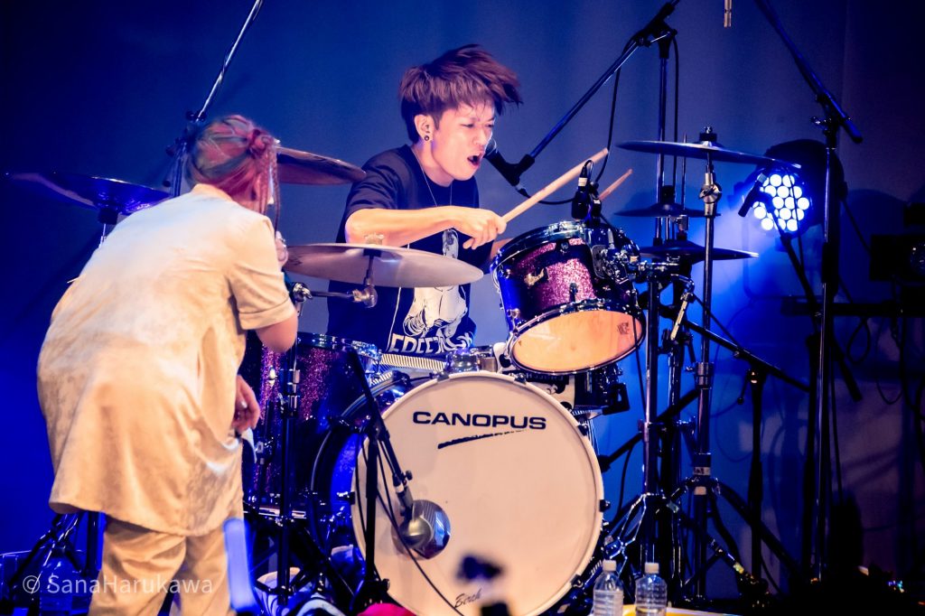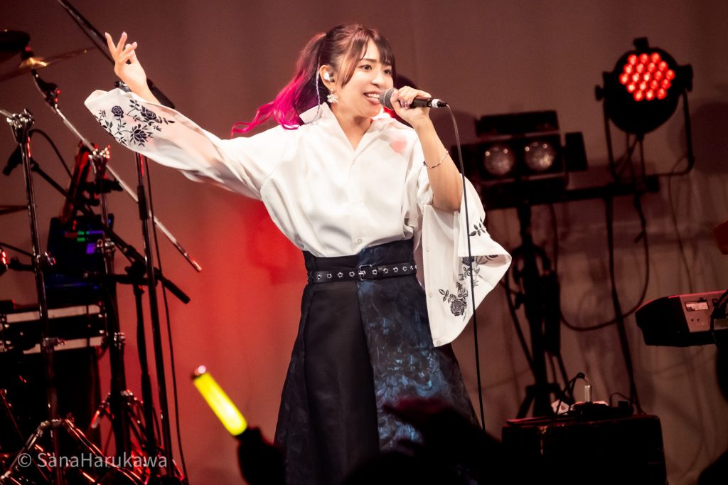 「響縁」で、さっそくフルバンドのグルーヴが響きます。Dr.ZACKさんの重くハードなビートに合わせるように、Ba.コンプさんの演奏もこころなしか普段よりハードになっているよう。「儚きもの人間」はもともと激しいロックナンバーですが、今日はさらに激しさを増していました。HR/HMと言わんばかりの音圧に対して、フロアはヘッドバンギングで応戦。みんなの首はさながら飛頭蛮になりました。