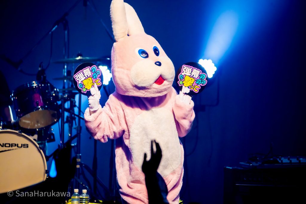 「待たせたな!石鹸屋だ!」と叫び、1曲目は「ってゐ! ~えいえんてゐver~」。のっけから石鹸屋の十八番でフロアを揺さぶります。この曲では「かごめ、かごめ」と、童謡の歌詞のようなシンガロングをするのが定番ですが、老若男女が集う今日も果たして上手くいくでしょうか。石鹸屋がどうだと言わんばかりに演奏をミュートにすると、フロアはそんな挑発に倍返しのシンガロングで応え、会場中に声が響き渡りました。
