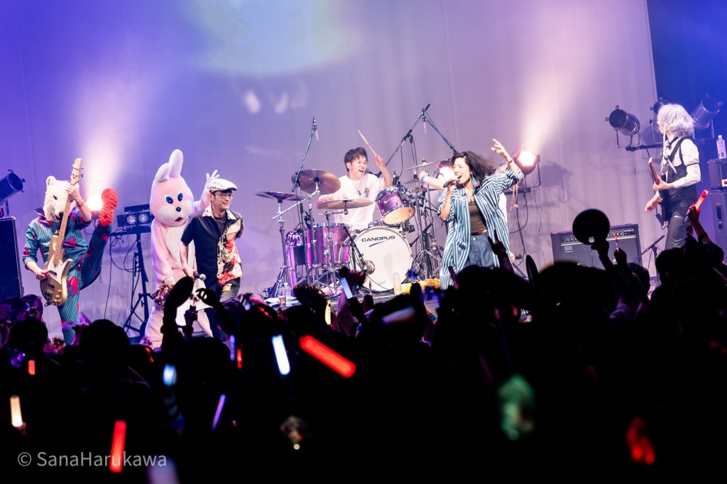 休みなく「Ghost Orchestra」「超々キューカンバー」と、岸田教団&THE明星ロケッツとして最新の東方アレンジアルバムからの連続攻撃で、フロアは一気にロックフェスの熱気へ。身体が自然に動き、声が自然に上がります。