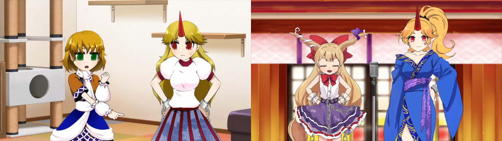 Q : 東方のキャラのデザインは原作でもよく変わったり、毎回変わる要素もあります。アニメションの素材を作る時一番最新のデザインに合わせるですか?目の色みたいいつも変わる部分や原作では隠れているので不明な部分ならどうやってデザインを決めるですか?