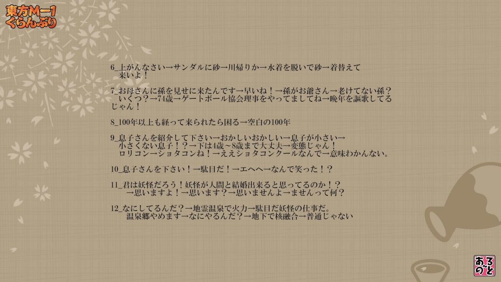 つまり東方M-1は、「このボケはウケるはずだ」「この流れなら納得されるだろう」という仮説を一つずつ積み重ねて作られています。