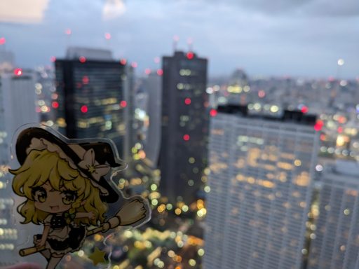 もちろん、魔理沙ちゃんと一緒なら、お空をお散歩することだってできます。日が落ちれば、ビル群がキラキラと輝き始めますしね。写真を撮るには最高のロケーションです。