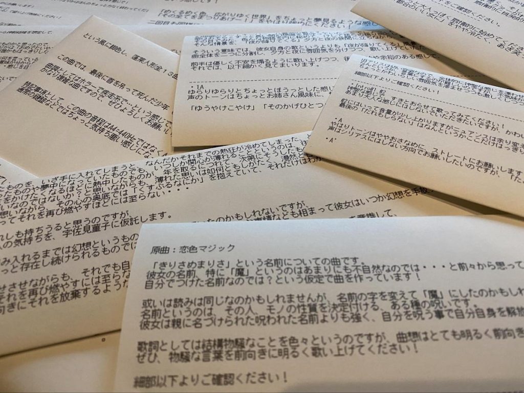 私はディレクションのテキストを他の人に比べてかなり長く書くみたいなんです。自分では「怪文書」と呼んでいるんですけど。まず原曲はこれでというのは当然書いて、このキャラクターはこういうキャラクターで、こういうシチュエーションなのでこれこれこういう感じで、というので大体10〜15行ぐらい埋まって、そこからAメロはこう、と続いていくんですけど、前に「こういうことを書く人は他にいません」と言われました。