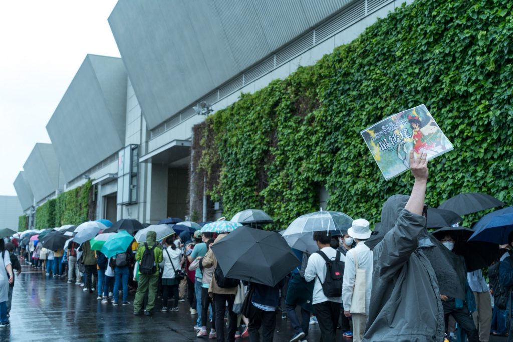 その後も「神主列」は伸び続け、ついには屋外に並ぶようになったらしいと聞いて、外に出てみました。小雨の降りしきるなか、最後尾からは先頭の様子が見えなくなるまで列が伸びています。12時すぎには、ZUNさんのTwitterで完売の報告がなされ、原作の変わらぬ人気を再確認させてくれました。