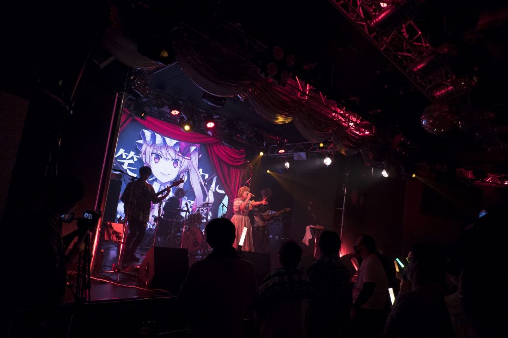 バックにはPVも投影され、ステージの幅ドンピシャに合わせられた赤いカーテンが広がります。「いつの間にカーテンが掛かったんだ?」本物と見紛うばかりにバッチリ溶けこんでいました。くぅ、憎い演出ですね!! PVの世界と現実の世界がつながっちゃいました。今回VJを担当されたのは、同PVの製作にも関わったRFさん。フロアの照明はフランドールのイメージカラーの紅に彩られ、演出にもただならぬ気合いを感じました。