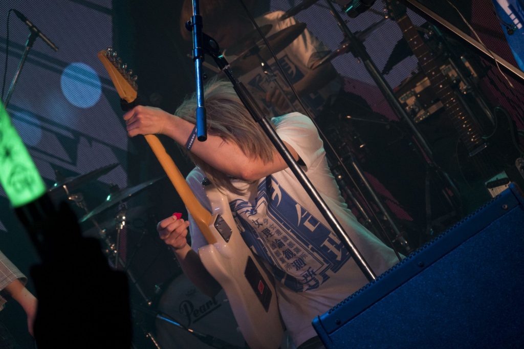 ゲストタイムが終わり、いつものメンバーで再開したのは『シューティングスターグライダー』。オリジナル曲のため、東方系のライブイベントではまずお目にかかれないオリジナル曲です。これもワンマンだからこその楽しみでしょう。配信で聴けて良かった! この機を逃したらいつ聴けるかわかりません。一気にギアをあげたフロアにお次は『アンノウンミラーガール』(原曲:妖怪裏参道)。高速のギターリフとドラムロールが鳴り響く! うきねさんの低音の発声がたまらなくカッコイイ。怒涛の勢いでフロアは制御不能に陥ります。