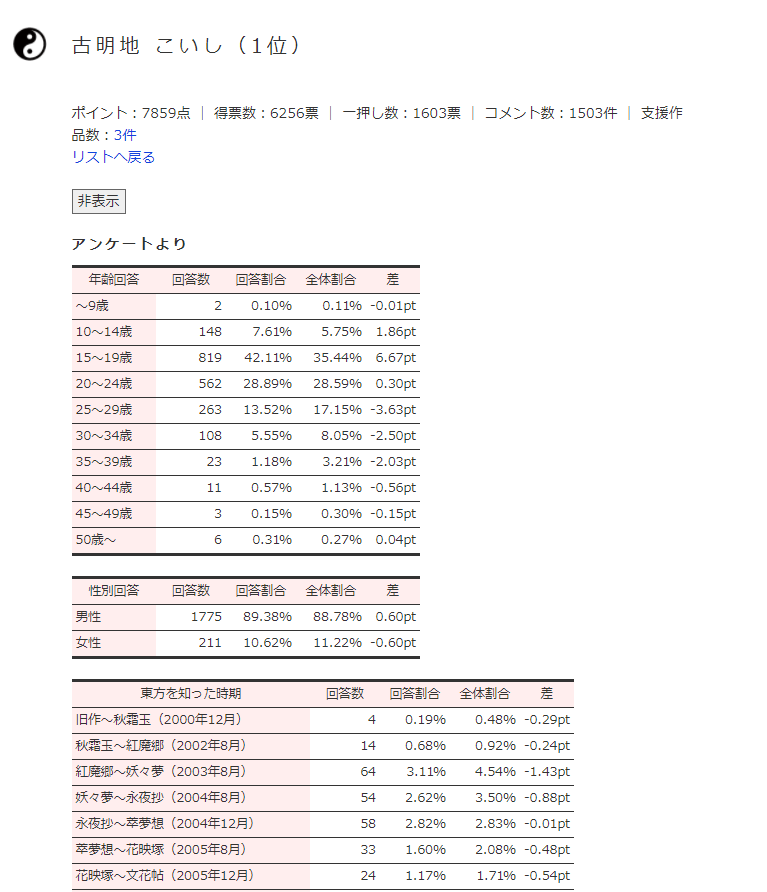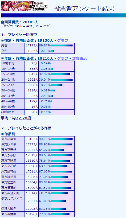 そして、キャラクターや楽曲、作品の人気だけではなく、付随するアンケート機能によって判明する、「今、東方を見ているファンたち」の年齢・地域・そして動向。このような、実質的な「ファンの国勢調査」にもなっているムーブメントがあるコンテンツは、世界的に見ても、東方Project以外には存在しないかもしれません。