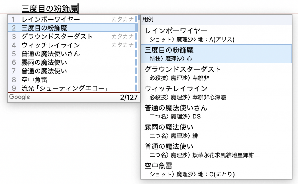 これがあれば、たとえば「霍青娥」だとか「東方剛欲異聞 ~ 水没した沈愁地獄」だとか「幽玄の槭樹 ~ Eternal Dream」のような、読めるけど漢字が出てこないような東方単語も簡単に入力ができます。一度使えばもうこれ無しでは生きていけない、我々のような東方クリエイターにとっての生命線とも言えるかもしれません。こんな便利なツールを無料で公開してくれているのですから、本当に頭が下がります。