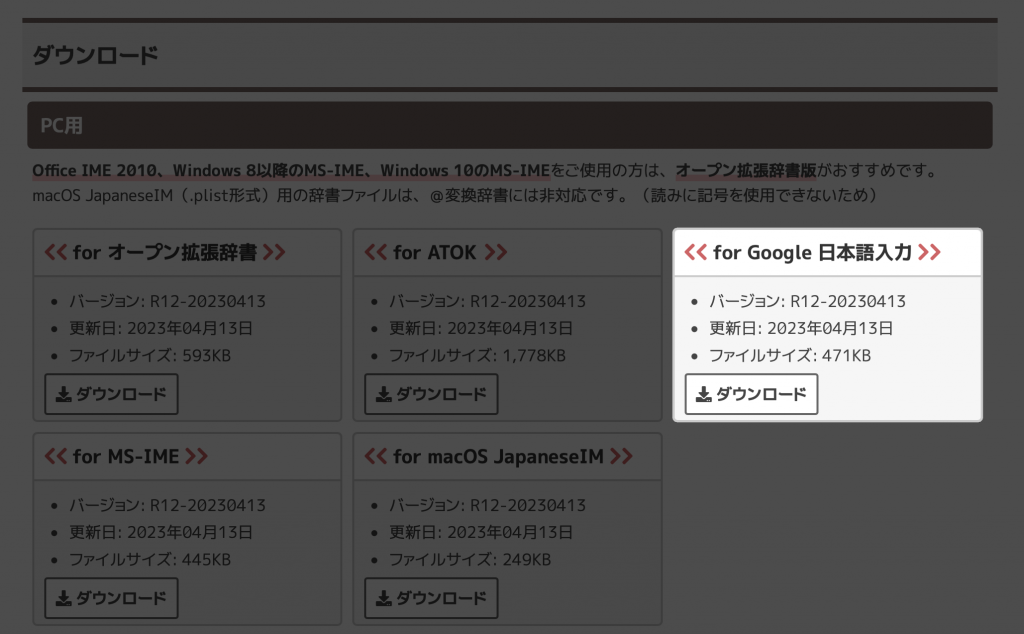 ここから、自分の仕様しているIMEに合った物をDLしましょう。今回は「Google日本語入力」に登録するため、3つ目にある専用のファイルを選択します。