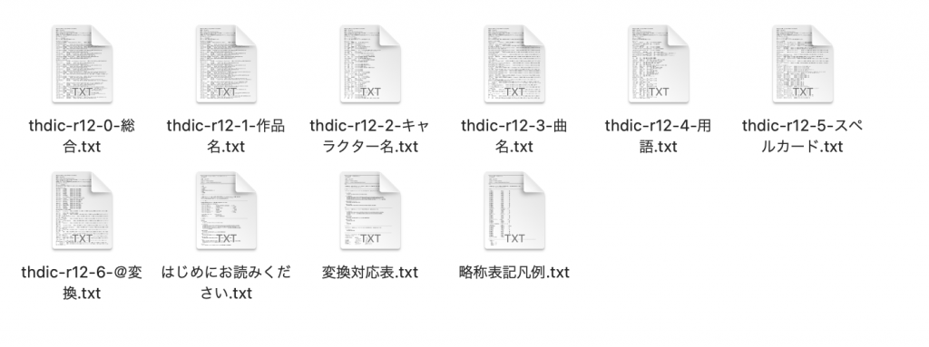 単語すべてを登録したいなら「thdic-r12-0-総合.txt」だけを使用しましょう。作品名や、キャラクター名だけを選んで登録したい人は、それ以降に並んでいるファイルから、好きなものを選んで下さい。