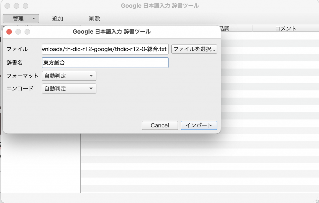 一番上の「ファイル」の項目に、自分が登録したい.txtファイルを選択してください。今回は試しに「thdic-r12-0-総合.txt」を選択します。