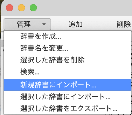 「辞書ツール」を開いて、「管理」→「新規辞書にインポート」を選択すると、登録画面が表示されます。