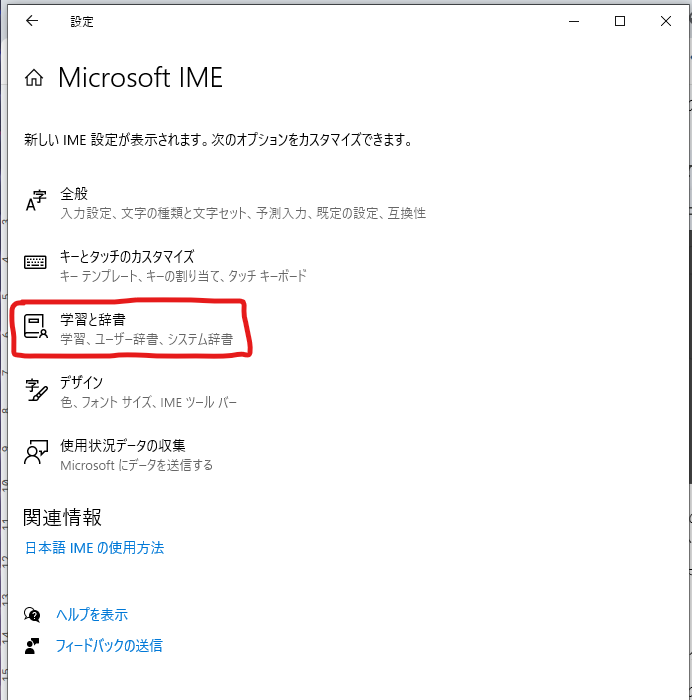 辞書ツールは「Microsoft IME」の下にある「設定」をクリック→「学習と辞書」をクリック→「ユーザー辞書ツールを開く」の手順で開くことができます。