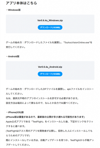 続いて、「東方Visionオンライン」の最新バージョン【※】のアプリ本体をダウンロードします。