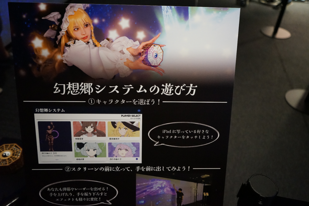 スクリーンの前に立ってポーズをとると、それに応じた弾幕が映し出される幻想郷システム。人生で一度は弾幕を撃ってみたい、そんなあなたの夢が叶うかもしれません。