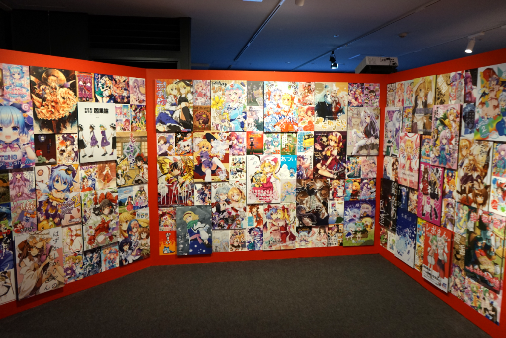 次のコーナーは二次創作に関する展示コーナー。そこには、壁一面を埋め尽くさんばかりの同人誌の表紙が飾られていました。こちらは各サークルからの応募によって集まった表紙画像を展示したものです。